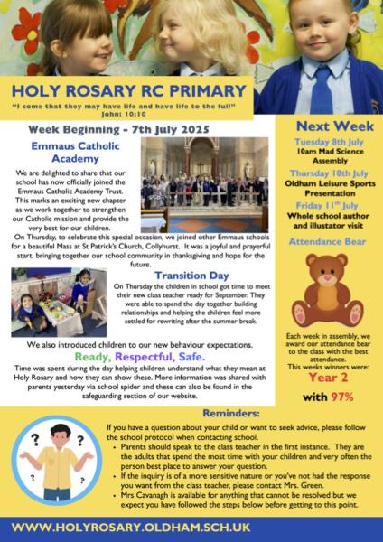 At Holy Rosary, we take great pride in being part of a wider catholic family CFOS. This week all of the children in Year 6 who are moving on in their education attended a celebration mass at Saint Mary's Church, Failsworth. This was a real celebration of our family and a truly special event.